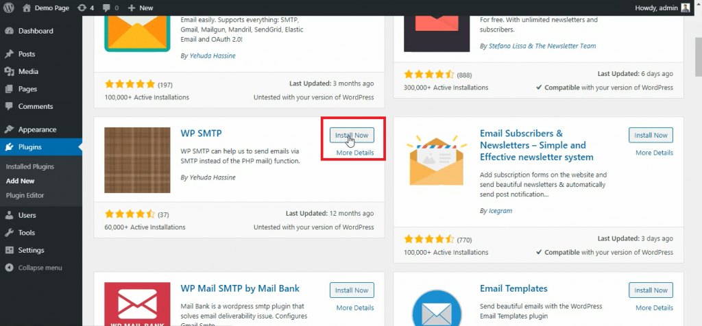 Step 4: On the right side you will get a search box in that, search for WP SMTP and hit enter.